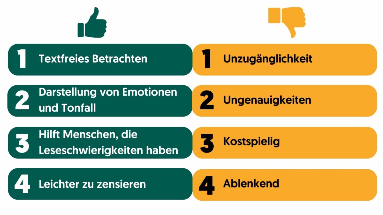 Unzugänglichkeit: Für diejenigen, die die Originalsprache nicht verstehen, erleichtert es die Synchronisation dem Video zu folgen. Während die Synchronisation für Menschen mit eingeschränktem Hörvermögen keinen Mehrwert bietet. Daher trägt sie wenig dazu bei, eine vollständige Zugänglichkeit zu ermöglichen.