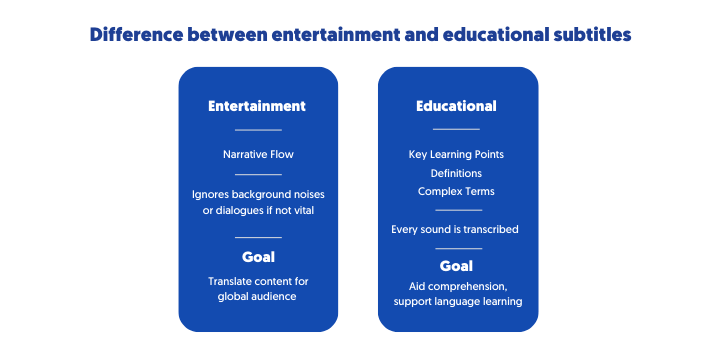 While educational and entertainment subtitling aim to make content accessible, their focus differs in the following ways: