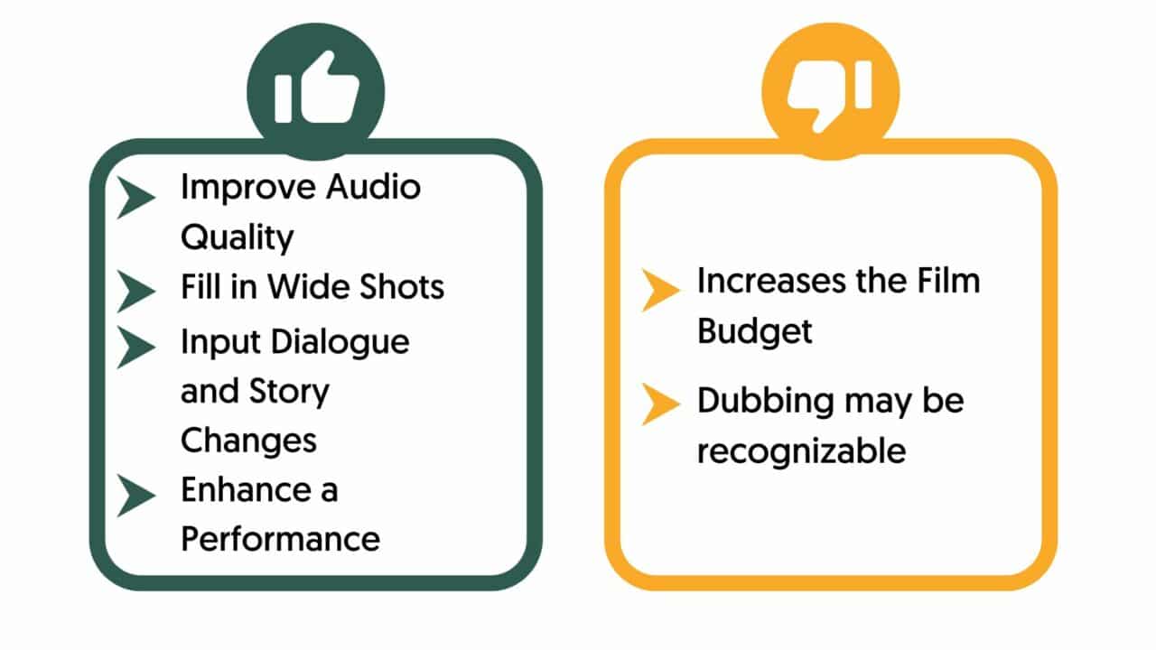• Expensive Technique: This dubbing technique is often expensive and can stretch a film budget significantly. It is also best if done by professionals who sound like the original artists as much as possible.