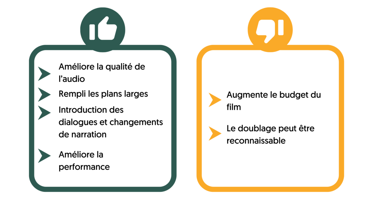 - Technique coûteuse : Cette technique de doublage est souvent coûteuse et peut grever considérablement le budget d’un film. Il est également préférable qu’elle soit réalisée par des professionnels dont la voix ressemble le plus possible à celle des artistes originaux.