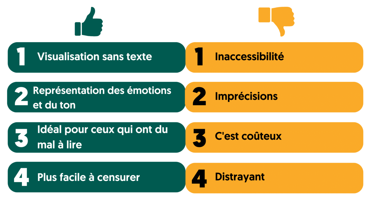 Inaccessibilité: Si le doublage permet aux personnes qui ne comprennent pas la langue originale de suivre plus facilement la vidéo, il n’aide pas les personnes qui ne peuvent pas entendre. Il ne permet donc pas une accessibilité totale.