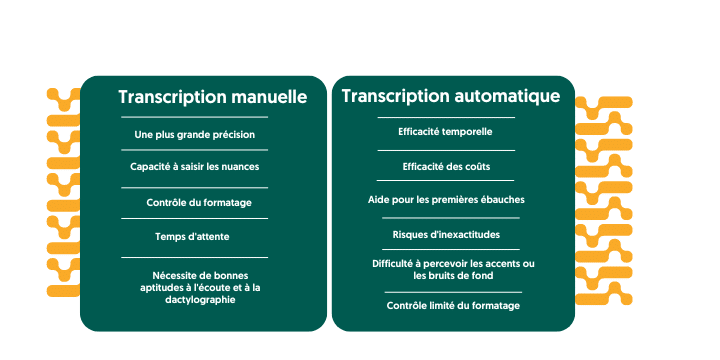 Lorsque vous décidez de la méthode de transcription, tenez compte de la nature de l’entretien et des ressources dont vous disposez. La transcription manuelle consiste à écouter l’enregistrement et à le transcrire mot par mot, tandis que les outils de transcription automatique utilisent un logiciel de reconnaissance vocale pour transcrire l’audio automatiquement. Si les outils automatisés permettent de gagner du temps, ils ne sont pas toujours aussi précis que la transcription humaine en raison des erreurs potentielles dans la reconnaissance vocale.