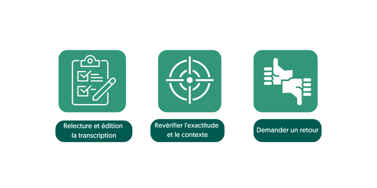Demandez à un collègue ou à un rédacteur en chef de relire votre transcription pour repérer les erreurs ou les omissions qui vous auraient échappé. Cette relecture supplémentaire peut apporter un éclairage nouveau et aider à repérer les erreurs que vous auriez pu négliger. Le retour d’information peut également contribuer à améliorer la clarté et la précision de la transcription.
